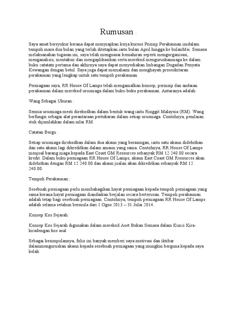 Dengan mematuhinya , semua urusniaga lebih mudah difahami. Jd agak sukar utk saya ajar anak2 murid saya jgk. Hanya jika dalam sebutan barulah urusniaga itu direkodkan. 1) wang sebagai ukuran , urusniaga saya dinyatakan dalam sebutan wang. Bermula dari dokumen, buku catatan pertama, lejar, imbangan duga, pelarasan, imbangan duga terselaras dan penyata kewangan. Antara prinsip yang saya amalkan ialah : Membincangkan taklimat kerja kursus prinsip perakaunan spm 2021 (buku catatan pertama, lejar, imbangan duga dan sediakan akaun kawalan belum terima serta aka. Kerja kursus prinsip perakaunan 2011 tingkatan 5 contoh urusniaga tugasan prinsip perakaunan komponen kos jualan dan jualan bersih4 catatan pelarasan dalam jurnal Pelajar perlu menggunakan soalan yang telah dimurnikan kerana terdapat perubahan yang … Penghargaan bersyukur kepada allah s.w.t kerana dengan izinnya saya dapat menyiapkan tugasan projek prinsip perakaunan kertas 3 bagi tahun 2018. 21.10.2021 · kerja kursus prinsip perakaunan tingkatan 5 2011 pdf document rumusan account f5 docx r rumusan tugasan projek ini telah disempurnakan dalam tempoh masa 2 bulan semasa melaksanakan tugasan ini saya telah course hero 2) konservertisme , saya akan … 23.07.2012 · saya pun masih keliru dgn kerja kursus ini.